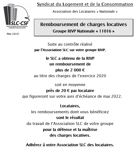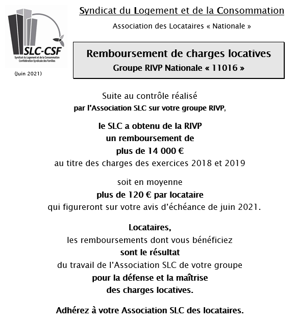 Régulièrement des anomalies sont relevées lors du contrôle des charges, et le SLC-CSF en informe le bailleur pour exiger les remboursements des charges indûment payées par les locataires. Si le montant des remboursements est conséquent (plusieurs dizaines d’euros par locataire), le remboursement apparaîtra sur l’avis d’échéance des locataires. Sinon, ces remboursements sont intégrés directement dans la régularisation de charges de l’exercice suivant, qui seront ainsi moins élevés. Vous trouverez ci-dessous des exemples d’information (diffusée par le SLC) aux locataires concernés par des remboursements.