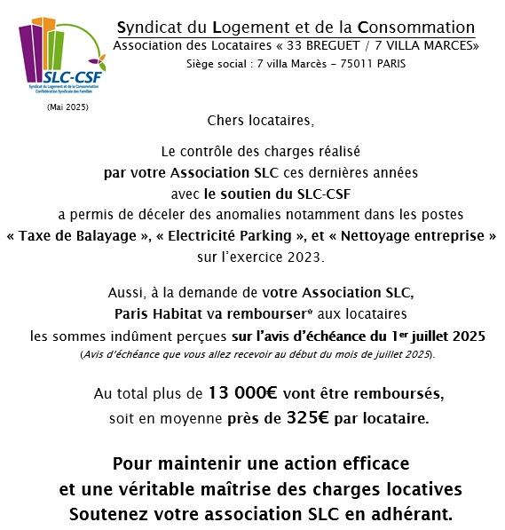 Remboursement de charges Groupe Paris Habitat Breguet 2023