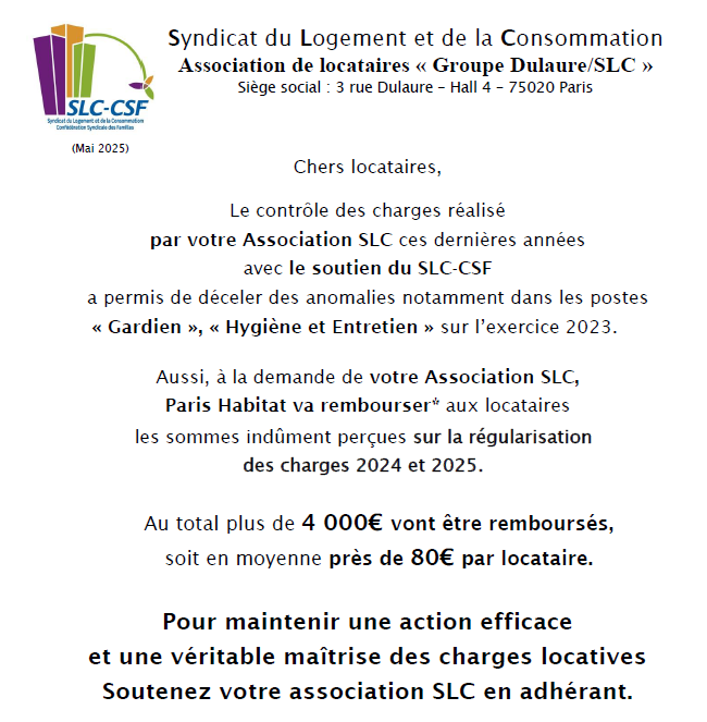 Remboursement de charges Groupe Paris Habitat Dulaure 2023