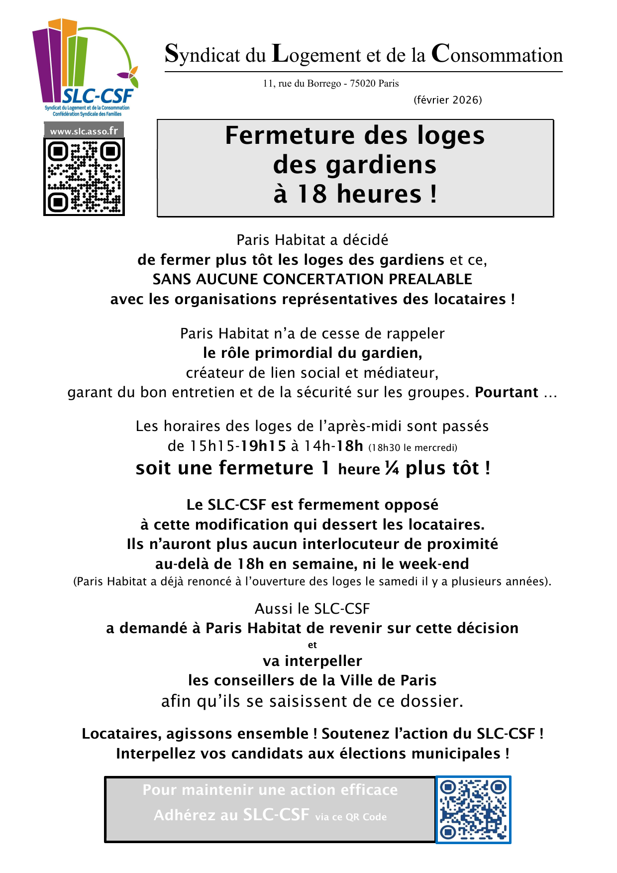 Interlocuteurs incontournables des bailleurs, le SLC-CSF et ses associations de locataires affiliées constituées sur les immeubles poursuivrons donc leurs actions pour la défense et le respect des droits et intérêts des locataires, en particulier dans les domaines, des charges locatives, des loyers et plus globalement de la maitrise de la quittance, des travaux liés à la vétusté dans les appartements ainsi qu’à la rénovation thermique des immeubles, de l’amélioration de la qualité du service rendu au locataires notamment en proximité et de la prise en compte des réclamations.